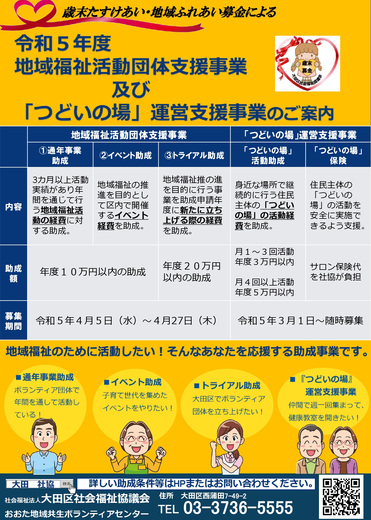 本事業は、大田区内において地域福祉活動を行う団体と社協が連携協働して、大田区において地域共生社会の実現に向けた活動を、安定的かつ持続的に推進することを旨とします。また、共同募金配分金を原資とし、地域住民が本事業の成果を通じて、共同募金活動への理解と共感を高めていくことができるよう取り組みます。