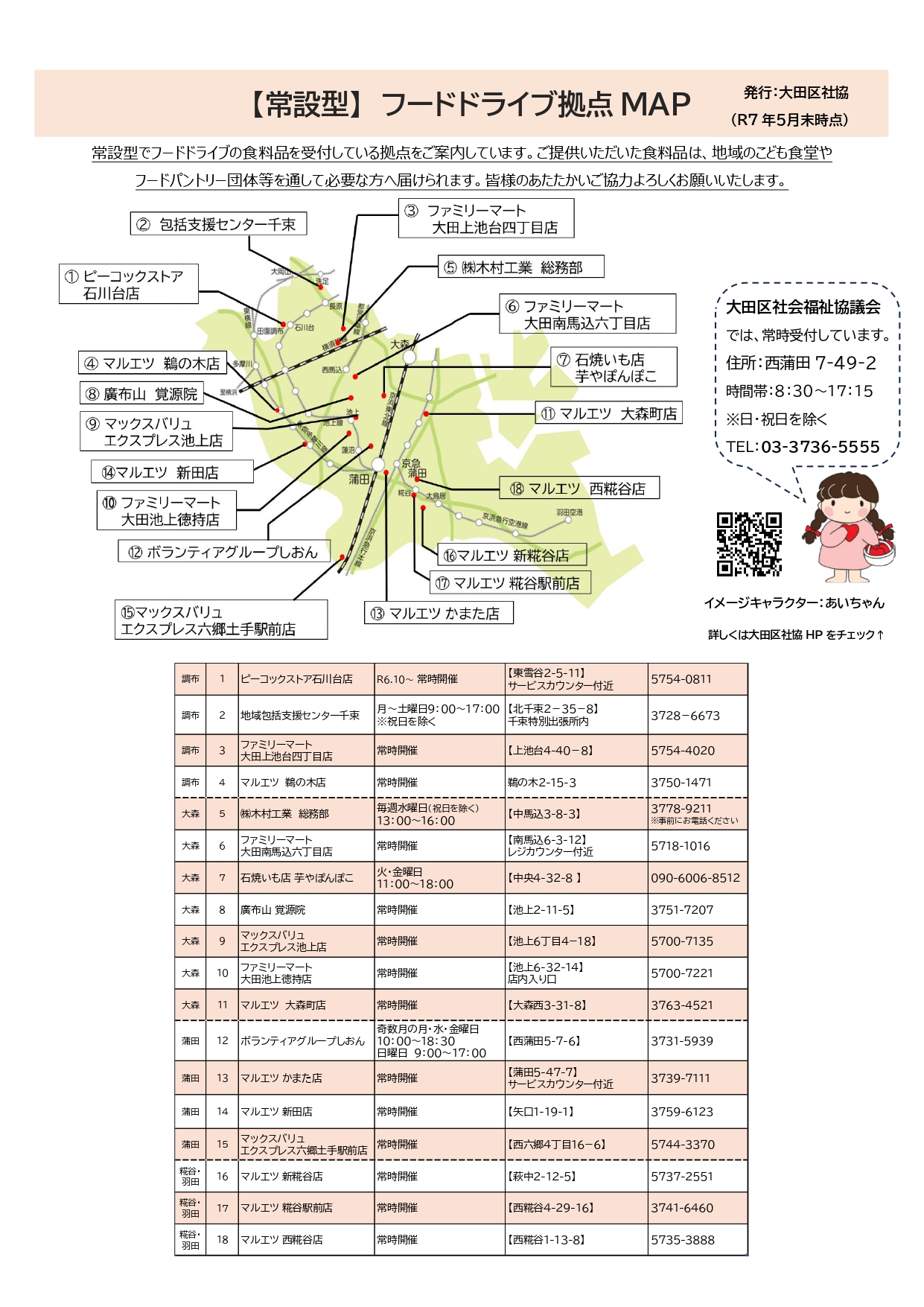 スーパー・コンビニの店舗内や地域の中でも、常設のフードドライブ拠点があります!(詳細は、以下のチラシをクリック⇩)