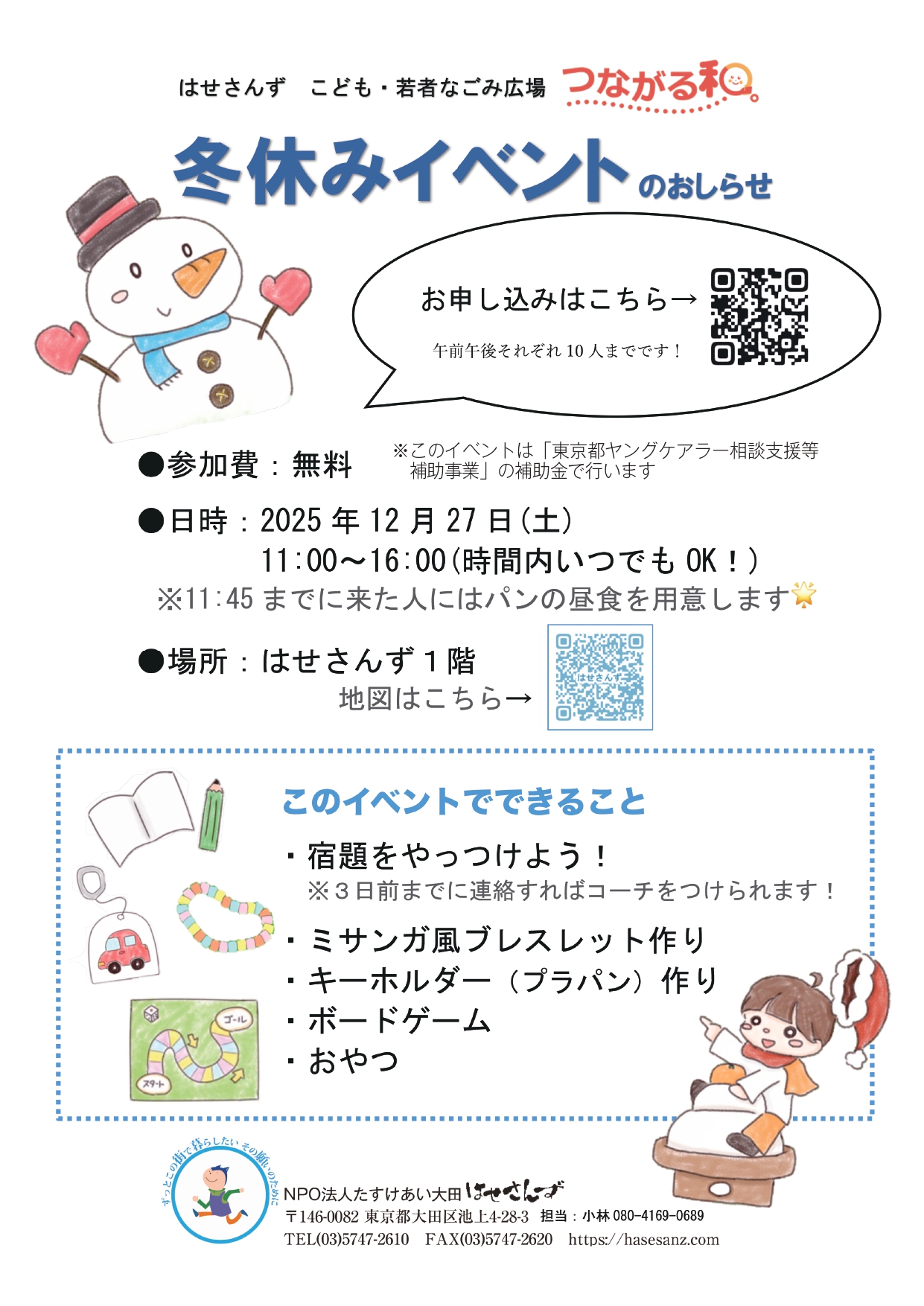 はせさんず こども・若者なごみ広場「つながる和。」では、冬休み最初の土曜日12月27日(土)に、はせさんず1階でイベントを開きます。小学生から高校生まで参加できます。ぜひ、参加してくださいね!