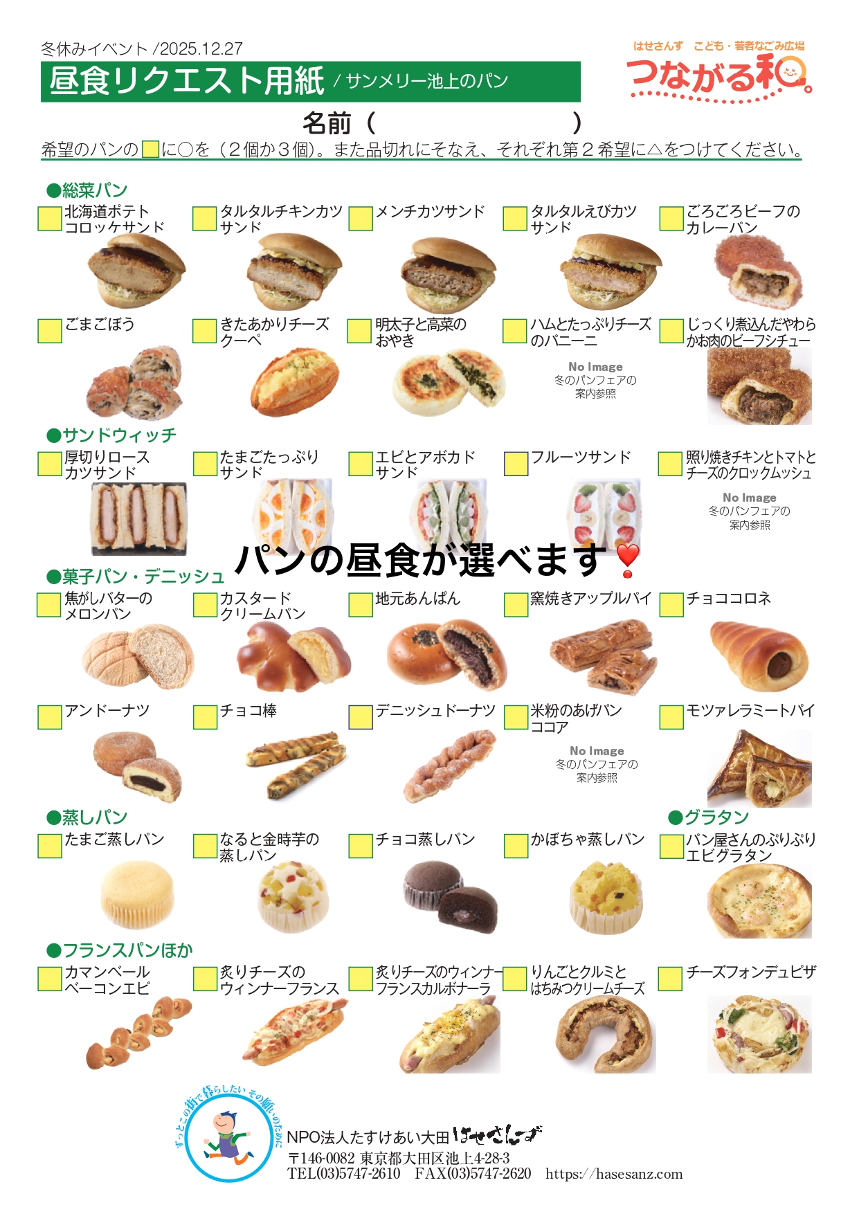 お昼前から来た人には、パンの昼食を用意します。池上駅前のサンメリー池上のパンメニューから、好きなものを選ぶことができますよ。飲み物がつきます。※午後にはおやつもあります。