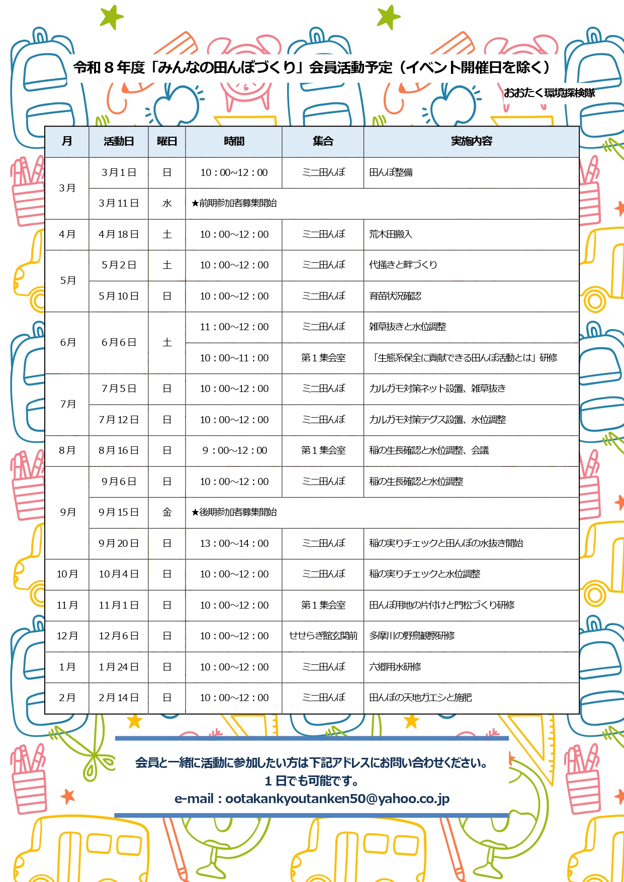 1)田んぼ整備:3/11,5/2,5/10,6/6,7/5,7/12,8/16,9/6,9/20,9/27を予定